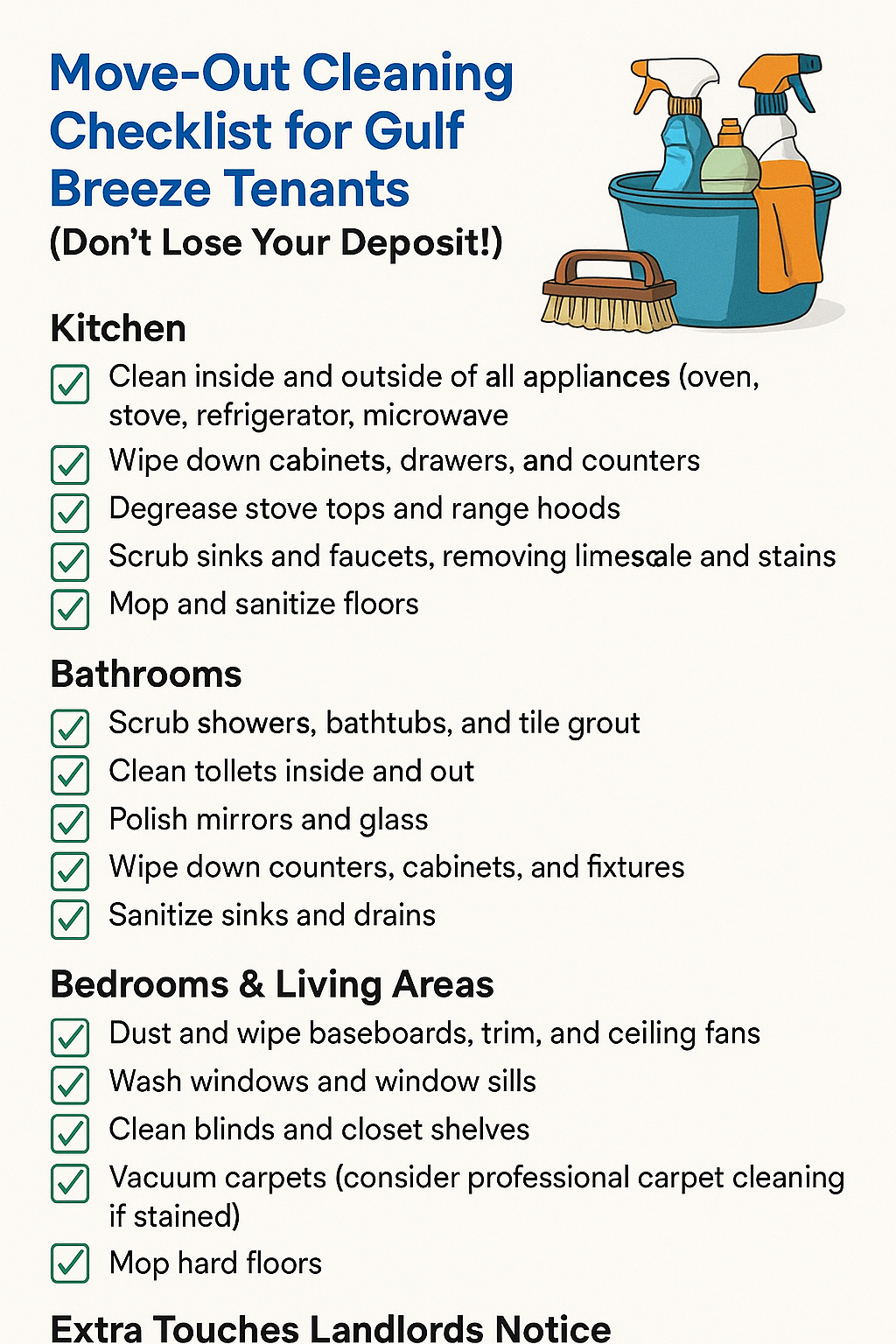 Moving out of your Gulf Breeze rental can be exciting, but it also comes with one major stress: getting your security deposit back. Landlords and property managers expect homes and apartments to be spotless when tenants leave. The problem is, most renters underestimate just how detailed move-out cleaning needs to be. That’s where this guide comes in. Below, we’ve put together a move-out cleaning checklist designed specifically for tenants in Gulf Breeze and surrounding areas. Follow these steps and you’ll increase your chances of walking away with your full deposit—and your landlord’s gratitude. Why Move-Out Cleaning Matters in Gulf Breeze Florida’s humid climate means dirt, mold, and grime can build up quickly in places you don’t always notice. Landlords and property managers are required to ensure rentals are clean and safe before the next tenant moves in, so they’ll often hold back part—or all—of your deposit if the property isn’t up to standard. Hiring a professional cleaning company like Ultimate Clean Professionals ensures your rental passes inspection the first time. But if you’re planning to do it yourself, here’s what you’ll need to cover. The Ultimate Move-Out Cleaning Checklist Kitchen Clean inside and outside of all appliances (oven, stove, refrigerator, microwave). Wipe down cabinets, drawers, and counters. Degrease stove tops and range hoods. Scrub sinks and faucets, removing limescale and stains. Mop and sanitize floors. Bathrooms Scrub showers, bathtubs, and tile grout. Clean toilets inside and out. Polish mirrors and glass. Wipe down counters, cabinets, and fixtures. Sanitize sinks and drains. Bedrooms & Living Areas Dust and wipe baseboards, trim, and ceiling fans. Wash windows and window sills. Clean blinds and closet shelves. Vacuum carpets (consider professional carpet cleaning if stained). Mop hard floors. Extra Touches Landlords Notice Wipe down light switches and door handles. Remove any nails, hooks, or adhesives from walls. Clean air vents and return covers. Ensure all trash and personal items are removed. Common Mistakes That Cost Tenants Their Deposit Forgetting appliances: Leaving crumbs in the oven or stains in the microwave. Ignoring grout and baseboards: These are big inspection points in Florida rentals. Leaving behind “little things”: Trash bags, hangers, or cleaning supplies left behind can get you charged. Not documenting your work: Always take before-and-after photos after cleaning to protect yourself. Save Time with Professional Move-Out Cleaning Moving is stressful enough—packing, paperwork, and hauling boxes take up most of your energy. Deep cleaning on top of that can be overwhelming. That’s why many tenants in Gulf Breeze, Navarre, and Pensacola turn to Ultimate Clean Professionals for reliable move-out cleaning. Our team handles every detail, from scrubbing kitchens to polishing bathrooms, so you don’t have to worry about losing your deposit. We also offer move-in cleaning if you want your new place fresh and spotless before unpacking. Book Your Move-Out Cleaning Today Don’t leave your security deposit to chance. Whether you’re moving out of an apartment, condo, or home in Gulf Breeze, Ultimate Clean Professionals has you covered. 📞 Call us at 850-783-3635 📍 Serving from Perdido Key to Mexico Beach, FL 💻 [Follow us on Facebook, Instagram, Nextdoor, and Reddit] body content of your post goes here. To edit this text, click on it and delete this default text and start typing your own or paste your own from a different source.